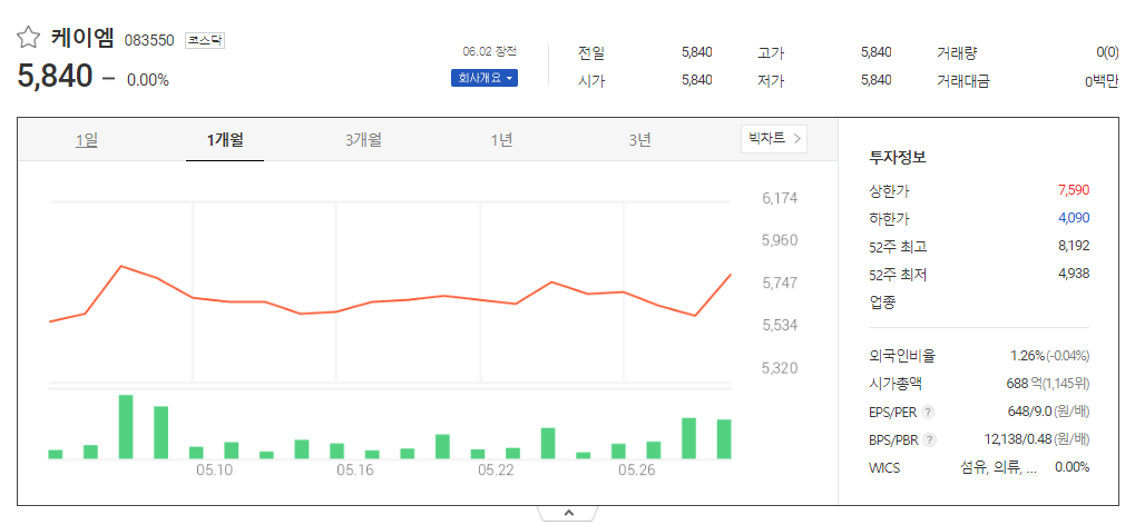 이 글에서는 케이엠 주가 전망과 목표 주가, 기업 정보에 대해서 설명합니다. 주식을 시작하기 위해서는 기업 주가와 재무 현황표에 대해서 분석하는 것이 필요합니다. 케이엠 주식의 주요 현황과 투자 정보를 확인하시고 현재 시장 현황을 살펴보겠습니다.