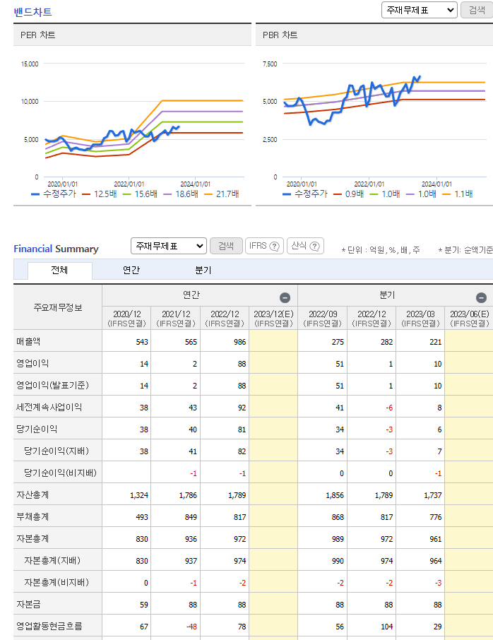 -2022년 12월 전년동기 대비 연결기준 매출액은 74.5% 증가, 영업이익은 5661.4% 증가, 당기순이익은 99.4% 증가. 주력 제품인 선박평형 수 통합제어감시시스템 및 LNGC용 가스안전 시스템 등 친환경제품에 적극적인 영업으로 매출이 크게 증가, 영업이익 대폭 확대. 2023년 광양사업장에 플로팅 도크 투자계획으로 투자가 완료 되는 2024년 하반기부터는 선박서비스 수리업 매출이 증가 할 것 으로 예상