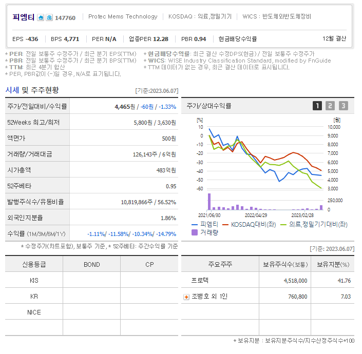 피엠티 현재 주가는 4,465원이며 전일 대비 -60원의 모습을 보이고 있습니다. 피엠티의 주주현황을 살펴보면 조병호(외 1인)이 지분 41.76%를 소유하고 있습니다. 피엠티는 반도체 및 관련장비 기업으로 장중 기준으로 주가는 4,465원 입니다. 삼성전자의 시가 총액은 489억 원이며 발행 주식수는 1.86주 입니다. 외국인 보유 비중은 126,143% 이며 장중 거래량은 10,819,866를 기록했습니다. 매출액은 35억 원, 영업이익은 -52억 원을 달성했습니다. EPS는 없음원이며 피엠티 주식 배당수익률은 % 입니다.