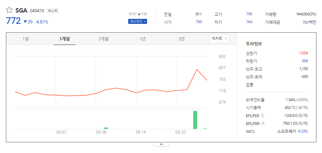 SGA 현재 주가는 811원이며 전일 대비 -2.76원의 모습을 보이고 있습니다. SGA의 주주현황을 살펴보면 에스지에이홀딩스(외 12인)이 지분 35.72%를 소유하고 있습니다. SGA는 일반 소프트웨어 기업으로 장중 기준으로 주가는 811원 입니다. 삼성전자의 시가 총액은 454억 원이며 발행 주식수는 1.54주 입니다. 외국인 보유 비중은 25,131,509% 이며 장중 거래량은 58,862,249를 기록했습니다. 매출액은 70억 원, 영업이익은 -22억 원을 달성했습니다.