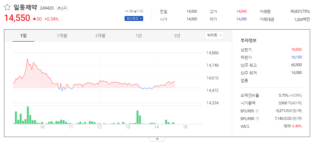 일동제약 현재 주가는 14,500원이며 전일 대비 -60원의 모습을 보이고 있습니다. 일동제약의 주주현황을 살펴보면 일동홀딩스(외 15인)이 지분 40.79%를 소유하고 있습니다. 일동제약는 제약 기업으로 장중 기준으로 주가는 14,500원 입니다. 시가 총액은 3881억 원이며 발행 주식수는 5.75주 입니다. 외국인 보유 비중은 120,463% 이며 장중 거래량은 26,803,285를 기록했습니다. 매출액은 1,461억 원, 영업이익은 -735억 원을 달성했습니다. 일동제약 주식 배당수익률은 -721% 입니다.