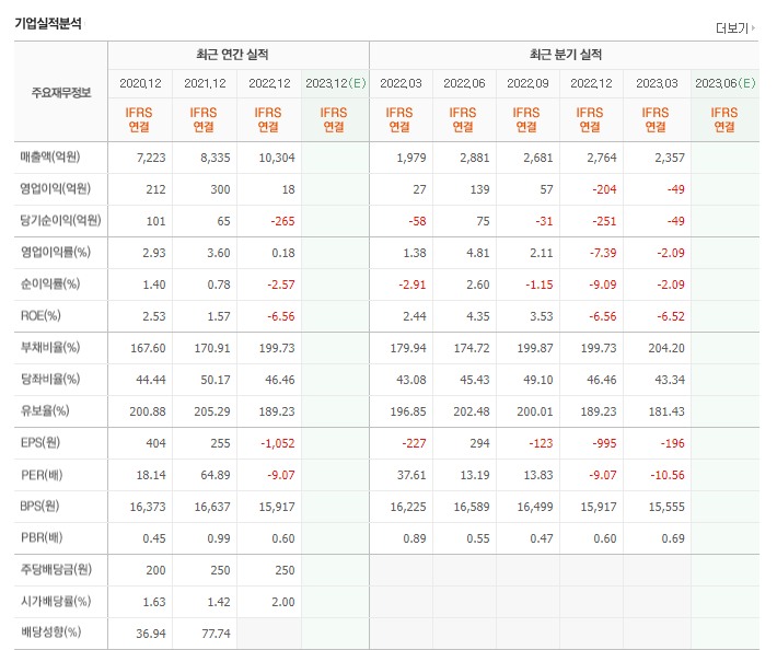 -2023년 3월 전년동기 대비 연결기준 매출액은 19.1% 증가, 영업이익 적자전환, 당기순손실은 13.8% 감소. 매출은 증가하였지만 시멘트 생산에 필요한 주요 원재료인 석고는 22%, 수재슬래그는 24% 증가하는 등 원가율이 증가함에 따라 영업이익은 적자전환함. 글로벌 경기둔화와 부동산 경기 위축, SOC 투자 감소 등으로수요가 하락 전환할 것으로 예상되지만, 견조한 착공실적을 바탕으로 완만한 하락세를 유지할 것으로 전망됨.