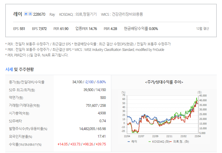 레이 현재 주가는 34,500원이며 전일 대비 +400원의 모습을 보이고 있습니다. 레이의 주주현황을 살펴보면 레이홀딩스(외 7인)이 지분 31.20%를 소유하고 있습니다. 레이는 의료 장비 및 서비스 기업으로 장중 기준으로 주가는 34,100원 입니다. 삼성전자의 시가 총액은 4960억 원이며 발행 주식수는 17.41주 입니다. 외국인 보유 비중은 751,607% 이며 장중 거래량은 14,482,055를 기록했습니다. 매출액은 1,290억 원, 영업이익은 34억 원을 달성했습니다. EPS는 1,535원이며 레이 주식 배당수익률은 0.73% 입니다.