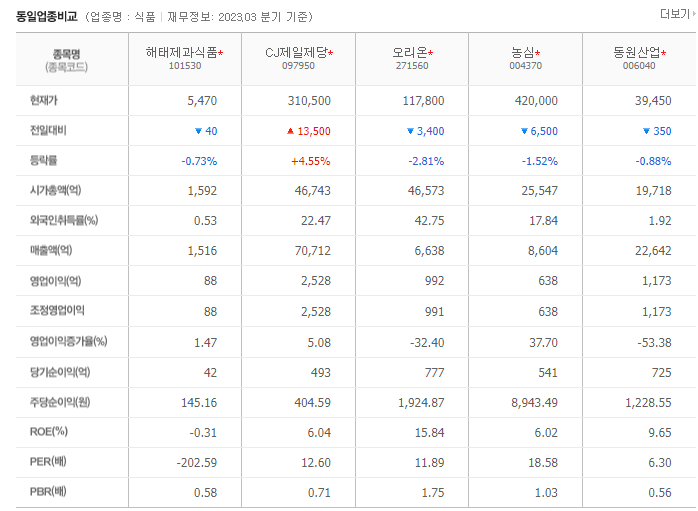 -2023년 3월 전년동기 대비 연결기준 매출액은 3.3% 증가, 영업이익은 62.1% 증가, 당기순이익은 56.8% 증가. 동사는 대규모 설비투자가 요구되는 장치산업으로 규모의 경제가 작용하여 높은 진입장벽을 형성하고 있으며, 상위 4개업체가 시장의 대부분을 점유하고 있음. 동사는 다양한 장수제품을 보유하고 있으며, 그 중에서도 연양갱은 동사의 역사와 함께 국내 최장수 브랜드로 자리 매김을 하고 있음.