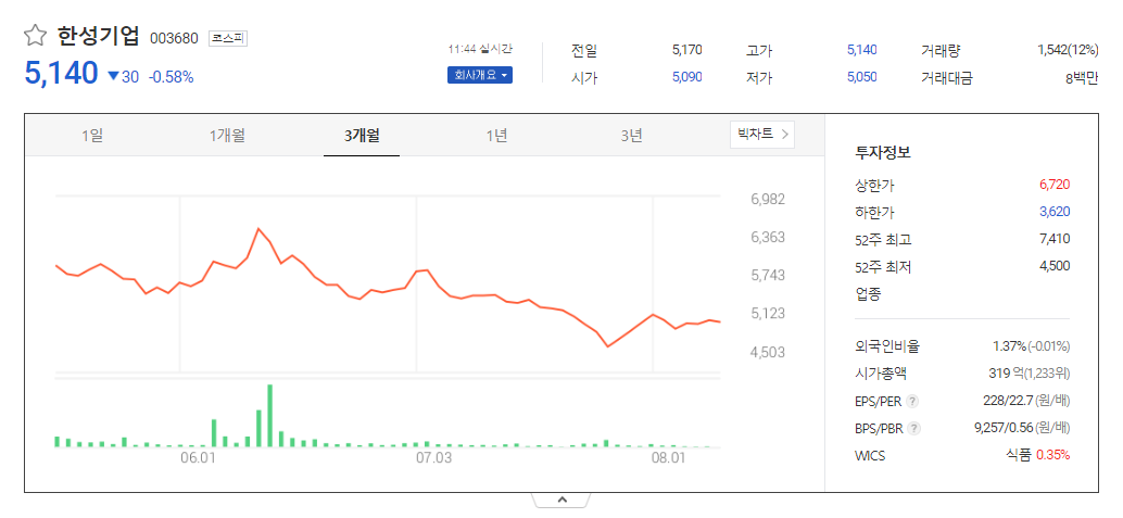 한성기업 현재 주가는 5,170원이며 전일 대비 -6.34원의 모습을 보이고 있습니다. 한성기업의 주주현황을 살펴보면 임우근(외 7인)이 지분 39.14%를 소유하고 있습니다. 한성기업는 식료품 기업으로 장중 기준으로 주가는 5,170원 입니다. 한성기업의 시가 총액은 319억 원이며 발행 주식수는 1.37주 입니다. 외국인 보유 비중은 12,453% 이며 장중 거래량은 6,209,515를 기록했습니다. 매출액은 753억 원, 영업이익은 71억 원을 달성했습니다. 한성기업 주식 배당수익률은 20.99% 입니다.