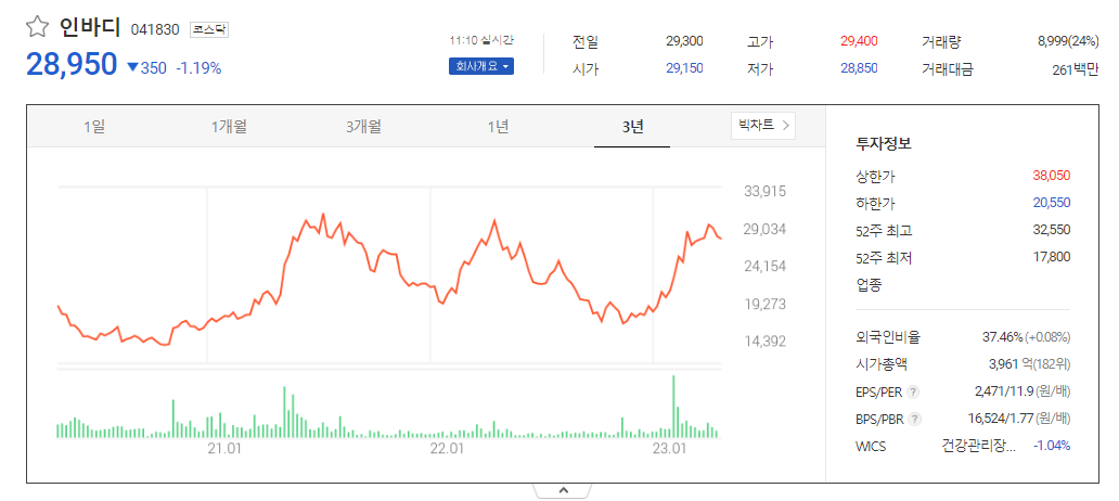 인바디 현재 주가는 28,950원이며 전일 대비 -350원의 모습을 보이고 있습니다. 인바디의 주주현황을 살펴보면 차기철(외 6인)이 지분 28.69%를 소유하고 있습니다. 인바디는 의료 장비 및 서비스 기업으로 장중 기준으로 주가는 29,300원 입니다. 삼성전자의 시가 총액은 3975억 원이며 발행 주식수는 37.46주 입니다. 외국인 보유 비중은 36,754% 이며 장중 거래량은 13,683,782를 기록했습니다. 매출액은 1,600억 원, 영업이익은 359억 원을 달성했습니다. EPS는 2,755원이며 인바디 주식 배당수익률은 1.49% 입니다.