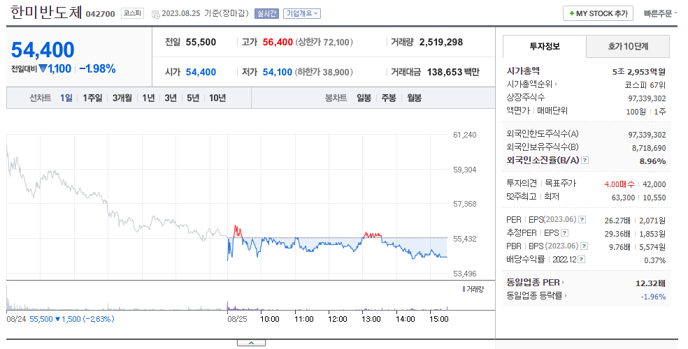 한미반도체 현재 주가는 55,500원이며 전일 대비 -1,500원의 모습을 보이고 있습니다. 한미반도체의 주주현황을 살펴보면 곽동신(외 8인)이 지분 55.22%를 소유하고 있습니다. 한미반도체는 반도체 및 관련장비 기업으로 장중 기준으로 주가는 55,500원 입니다. 삼성전자의 시가 총액은 5조2953억 원이며 발행 주식수는 8.96주 입니다. 외국인 보유 비중은 6,139,264% 이며 장중 거래량은 97,339,302를 기록했습니다. 매출액은 756억 원, 영업이익은 1,119억 원을 달성했습니다. EPS는 1,853원이며 한미반도체 주식 배당수익률은 1.74% 입니다.