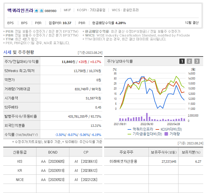 이 글에서는 맥쿼리인프라 주가 전망과 목표 주가, 기업 정보에 대해서 설명합니다. 주식 시장에서 중요한 것은 미래의 기업 가치를 예측하고 선제적으로 움직이는 것입니다. 투자할 종목을 고르기 전에 현재 기업의 현황과 데이터를 확인하는 것이 필요합니다. 맥쿼리인프라 주식의 주요 현황과 투자 정보를 확인하시고 주식 투자를 고민하고 계시다면 유용한 정보들을 모아 놓은 자료를 확인해보세요..