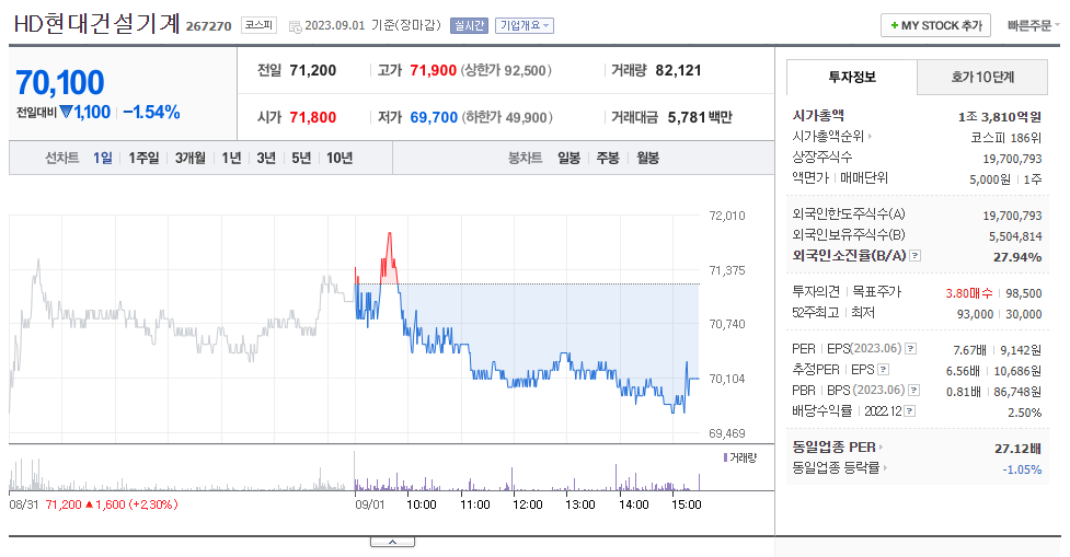 HD현대일렉트릭 현재 주가는 70,400원이며 전일 대비 -5.25원의 모습을 보이고 있습니다. HD현대일렉트릭의 주주현황을 살펴보면 현대중공업지주(외 7인)이 지분 40.04%를 소유하고 있습니다. HD현대일렉트릭는 전기장비 기업으로 장중 기준으로 주가는 70,400원 입니다. 삼성전자의 시가 총액은 2조2746억 원이며 발행 주식수는 17.48주 입니다. 외국인 보유 비중은 241,656% 이며 장중 거래량은 36,047,135를 기록했습니다. 매출액은 12,111억 원, 영업이익은 1,330억 원을 달성했습니다. EPS는 4,827원이며 HD현대일렉트릭 주식 배당수익률은 1.18% 입니다.