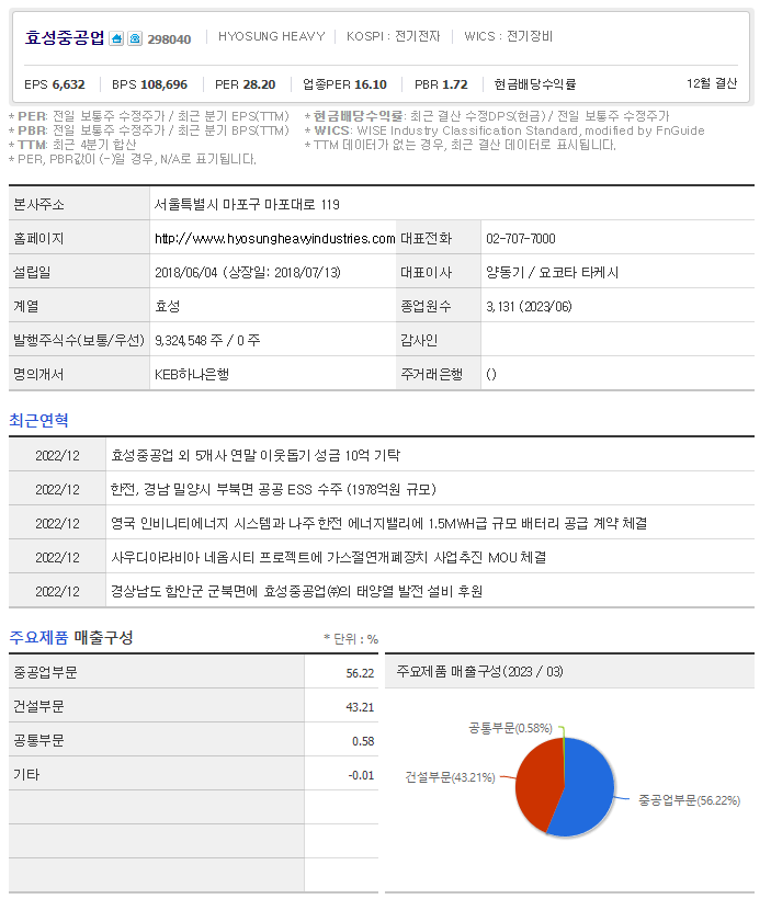 -동사는 2018년 6월 1일을 분할기일로 하여 효성이 영위하는 사업 중 건설/중공업 사업부문이 인적분할하여 신설되었음. 주로 전력산업의 핵심 설비인 변압기, 차단기와 산업 생산설비 등에 필요한 전동기, 기어 등을 생산·판매함. 이 외에도 건설사업 분야에도 진입해있음. 또한 현재 각종 수요에 대응하기 위한 170kV 50kA GIS 및 154kV Shunt Reactor, compact형 변압기 등을 연구개발 중임.