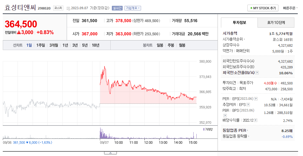 이 글에서는 효성티앤씨 주가 전망과 목표 주가, 기업 정보에 대해서 설명합니다. 주식 거래에서 중요한 부분은 현재 기업 가치보다는 미래의 기업 가치를 예측하고 먼저 행동하는 것입니다. 투자할 종목을 고르기 전에 현재 기업의 상황과 지표를 살펴보는 것이 중요합니다. 효성티앤씨 주식의 주요 현황과 투자 정보를 확인하시고 주식 투자에 도움이 되는 자료를 모아두었으니 참고하셔서 투자에 도움을 받으시길 바랍니다..