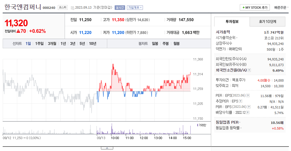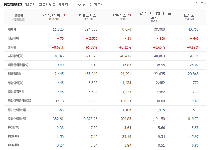 한국앤컴퍼니 현재 주가는 11,250원이며 전일 대비 -2.26원의 모습을 보이고 있습니다. 한국앤컴퍼니의 주주현황을 살펴보면 조현범(외 20인)이 지분 72.45%를 소유하고 있습니다. 한국앤컴퍼니는 자동차부품 기업으로 장중 기준으로 주가는 11,250원 입니다. 시가 총액은 1조747억 원이며 발행 주식수는 9.49주 입니다. 외국인 보유 비중은 142,174% 이며 장중 거래량은 94,935,240를 기록했습니다. 매출액은 4,739억 원, 영업이익은 2,452억 원을 달성했습니다. EPS는 1,785원이며 한국앤컴퍼니 주식 배당수익률은 4.66% 입니다.