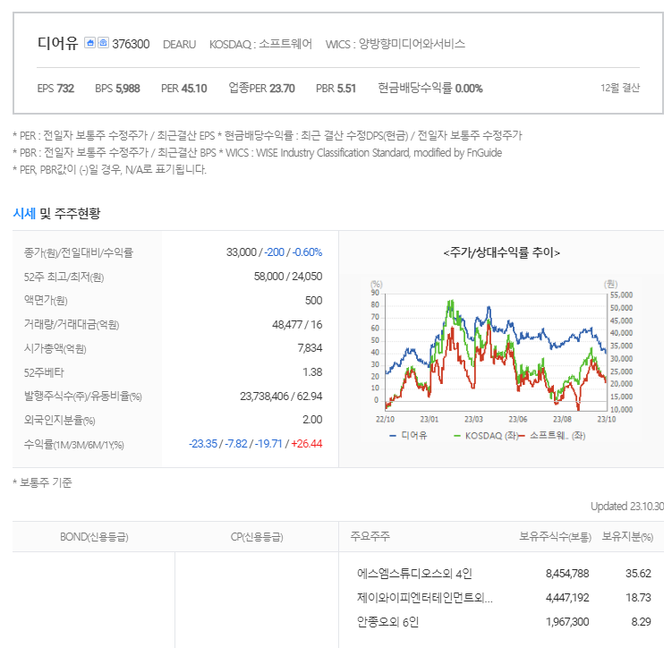 디어유 현재 주가는 33,000원이며 전일 대비 -200원의 모습을 보이고 있습니다. 디어유의 주주현황을 살펴보면 에스엠스튜디오스(외 4인)이 지분 35.62%를 소유하고 있습니다. 디어유는 인터넷 서비스 기업으로 장중 기준으로 주가는 33,000원 입니다. 디어유 시가 총액은 7561억 원이며 발행 주식수는 2.00주 입니다. 외국인 보유 비중은 48,477% 이며 장중 거래량은 23,738,406를 기록했습니다. 매출액은 355억 원, 영업이익은 163억 원을 달성했습니다. EPS는 1,227원입니다.
