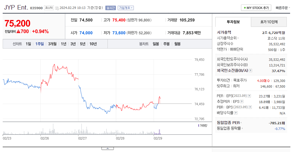 JYP Ent. 현재 주가는 74,500원이며 전일 대비 -9.04원의 모습을 보이고 있습니다. JYP Ent.의 주주현황을 살펴보면 박진영(외 3인)이 지분 15.95%를 소유하고 있습니다. JYP Ent.는 미디어 기업으로 장중 기준으로 주가는 74,500원 입니다. 삼성전자의 시가 총액은 2조6436억 원이며 발행 주식수는 37.47주 입니다. 외국인 보유 비중은 458,775% 이며 장중 거래량은 35,532,492를 기록했습니다. 매출액은 4,094억 원, 영업이익은 966억 원을 달성했습니다. EPS는 3,977원이며 JYP Ent. 주식 배당수익률은 26,472% 입니다.