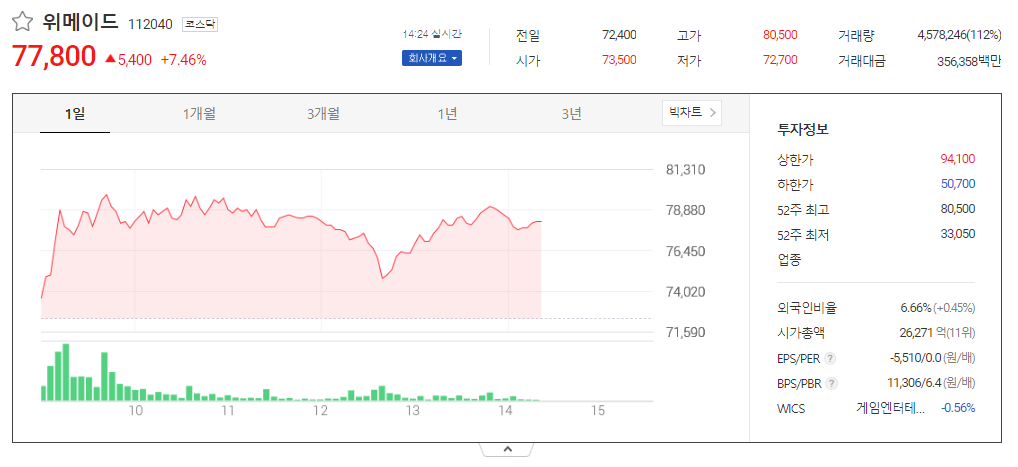 위메이드 현재 주가는 72,400원이며 전일 대비 원의 모습을 보이고 있습니다. 위메이드의 주주현황을 살펴보면 박관호(외 1인)이 지분 40.46%를 소유하고 있습니다. 위메이드는 게임 소프트웨어 기업으로 장중 기준으로 주가는 72,400원 입니다. 위메이드 시가 총액은 2조6407억 원이며 발행 주식수는 6.66주 입니다. 외국인 보유 비중은 4,077,868% 이며 장중 거래량은 33,897,976를 기록했습니다. 매출액은 4,887억 원, 영업이익은 -849억 원을 달성했습니다. EPS는 2,346원이며 위메이드 주식 배당수익률은 2.38% 입니다.