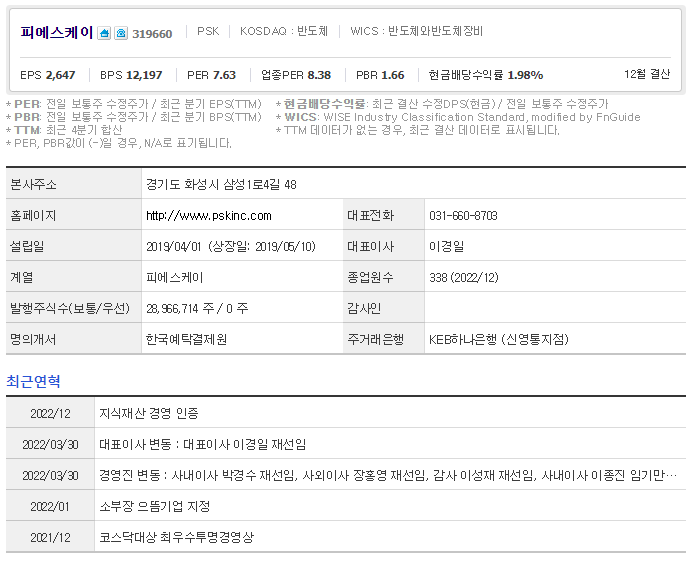 피에스케이는 반도체 및 관련장비 기업입니다. 대표자는 이경일 이며 설립일은 2019/04/01, 주식 상장일은 2019/05/10입니다. 전체 종업원 수는338명 이고 본사 주소는 경기도 화성시 삼성1로4길 48입니다.