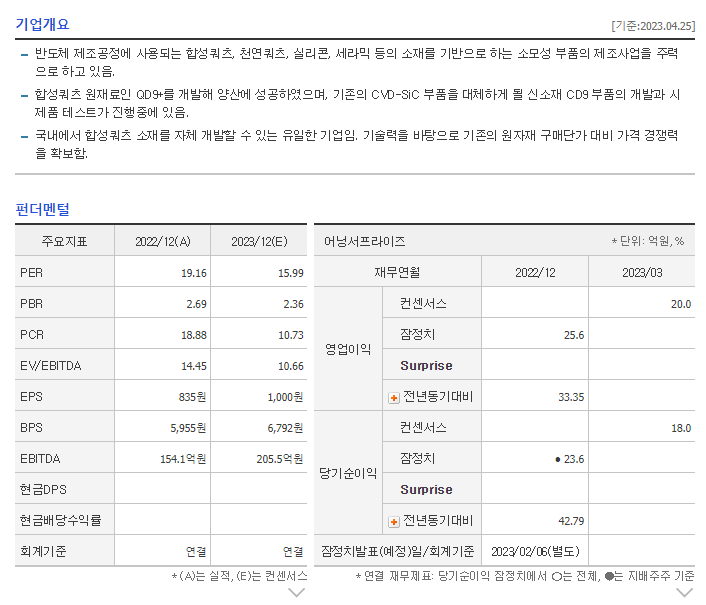 -반도체 제조공정에 사용되는 합성쿼츠, 천연쿼츠, 실리콘, 세라믹 등의 소재를 기반으로 하는 소모성 부품의 제조사업을 주력으로 하고 있음. 합성쿼츠 원재료인 QD9+를 개발해 양산에 성공하였으며, 기존의 CVD-SiC 부품을 대체하게 될 신소재 CD9 부품의 개발과 시제품 테스트가 진행중에 있음. 국내에서 합성쿼츠 소재를 자체 개발할 수 있는 유일한 기업임. 기술력을 바탕으로 기존의 원자재 구매단가 대비 가격 경쟁력을 확보함.