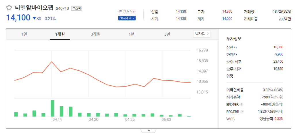티앤알바이오팹 주가 분석