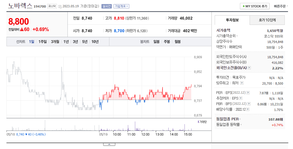 노바렉스 현재 주가는 8,740원이며 전일 대비 -40원의 모습을 보이고 있습니다. 노바렉스의 주주현황을 살펴보면 권석형(외 9인)이 지분 31.01%를 소유하고 있습니다. 노바렉스는 식료품 기업으로 장중 기준으로 주가는 8,740원 입니다. 삼성전자의 시가 총액은 1639억 원이며 발행 주식수는 2.22주 입니다. 외국인 보유 비중은 52,194% 이며 장중 거래량은 18,754,848를 기록했습니다. 매출액은 2,817억 원, 영업이익은 300억 원을 달성했습니다. EPS는 없음원이며 노바렉스 주식 배당수익률은 1.48% 입니다.