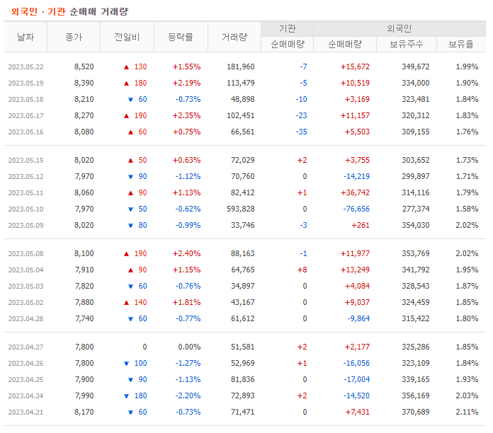 이중에 가장 좋은 것은 외국인과 기관 모두 매수하는 쌍끌이 주식 종목을 투자하는 것입니다. 양대 매수주체들이 같이 매수하는 것은 그만큼 좋은 종목이라는 뜻입니다. 해당 종목의 주가 전망을 분석하려면 기업체 상태를 분석하고 시장 흐름에서의 위치를 확인해야 합니다. 그리고 기관과 외국인 매수 추세까지 알아본다면 투자에 있어서 확률을 올리는 것이 가능합니다.