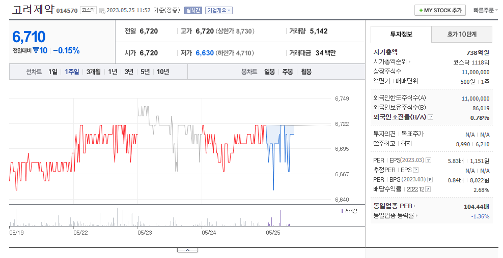 고려제약 현재 주가는 6,720원이며 전일 대비 -7.69원의 모습을 보이고 있습니다. 고려제약의 주주현황을 살펴보면 박상훈(외 4인)이 지분 50.19%를 소유하고 있습니다. 고려제약는 제약 기업으로 장중 기준으로 주가는 6,720원 입니다. 삼성전자의 시가 총액은 735억 원이며 발행 주식수는 0.78주 입니다. 외국인 보유 비중은 10,710% 이며 장중 거래량은 11,000,000를 기록했습니다. 매출액은 201억 원, 영업이익은 143억 원을 달성했습니다. EPS는 없음원이며 고려제약 주식 배당수익률은 % 입니다.